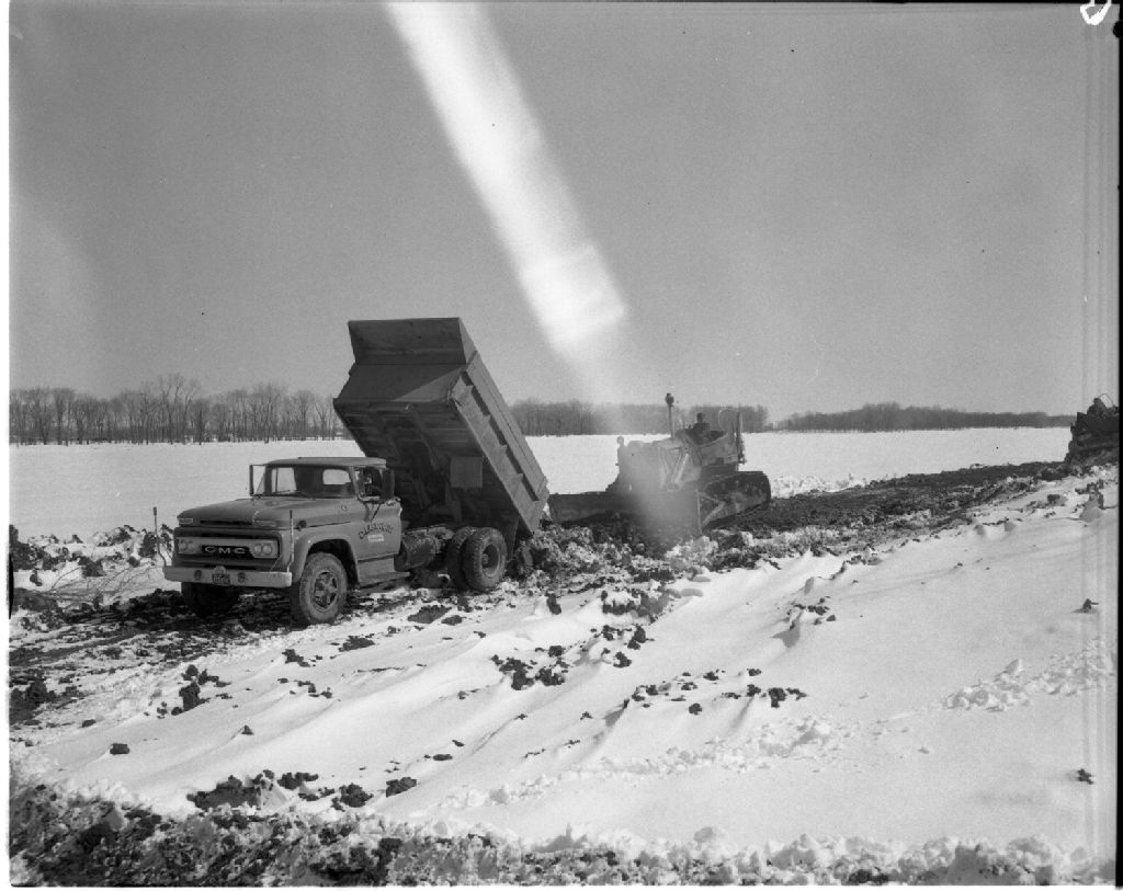 Grues et camions de la compagnie de construction Campeau, 21 mars 1963, Archives nationales à Gatineau, Fonds Champlain Marcil, (07H,P174,S1,D29892), Marcil, Champlain.