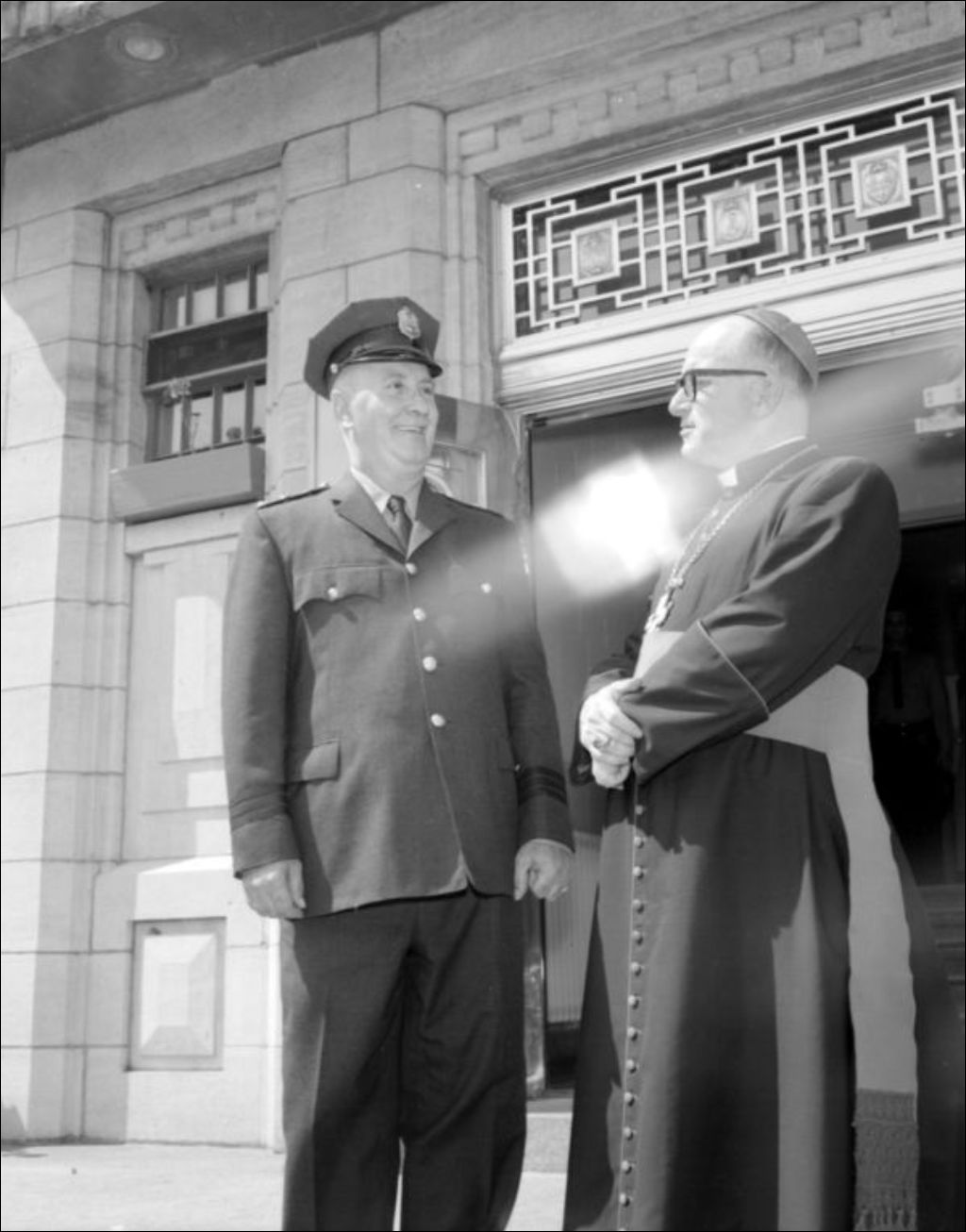 Visite de Monseigneur Paul-Émile Charbonneau à la prison de Hull, 28 juin 1963, Archives nationales à Gatineau, Fonds Champlain Marcil, (07H,P174,S1,D31122), Photographe non identifié.