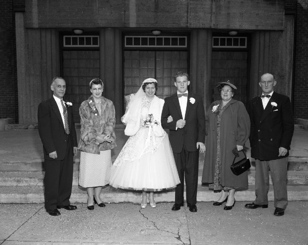 Mariage de Denis St-Amour et Mlle Gagnon, Église Sainte-Bernadette de Hull, 3 novembre 1956, Archives nationales à Gatineau, Fonds Champlain Marcil, (07H,P174,S1,D9975), Marcil, Champlain.