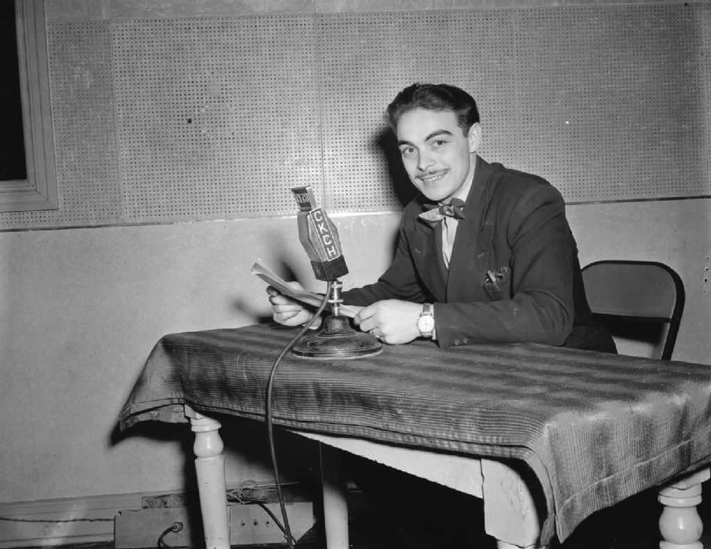 Henri Bergeron, annonceur au micro de CKCH, 22 février 1949, Archives nationales à Gatineau, Fonds Champlain Marcil, (07H,P174,S6,D1037), Marcil, Champlain.
