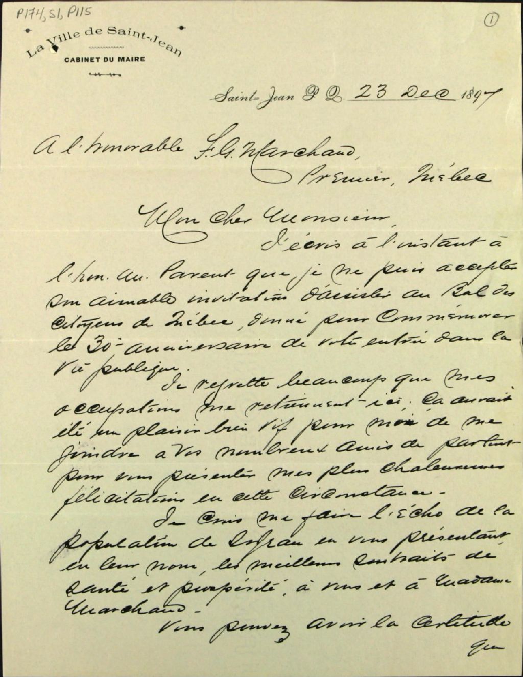 - Hébert, maire de Saint-Jean, regrette de ne pouvoir assister au bal du 30e anniversaire de vie publique de Marchand. Souhaits de prospérité et de santé à Marchand et à sa femme