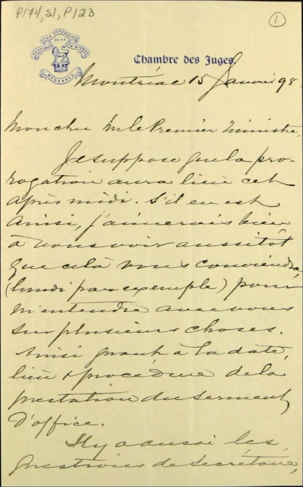 - Assermentation de Jetté : Désire voir Marchand à Montréal aussitôt la session close pour s¿entendre avec lui au sujet de son assermentation comme lieutenant-gouverneur et du personnel dont il aura besoin