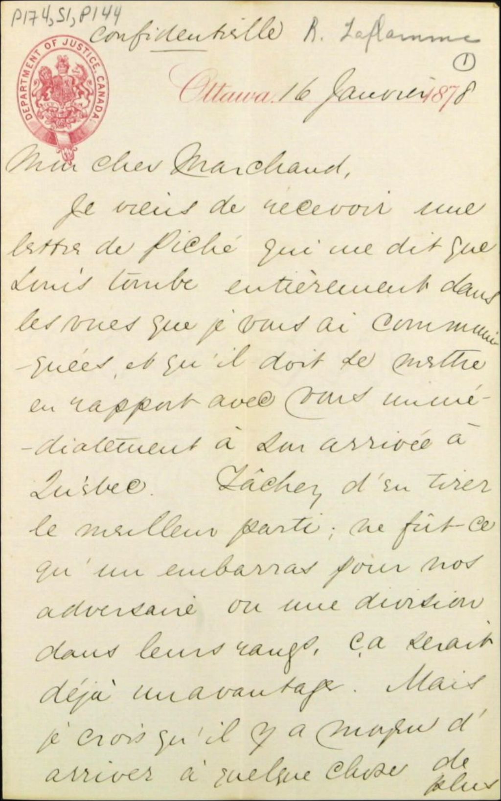 - Correspondance confidentielle : Louis doit se mettre en contact avec Marchand immédiatement après son arrivée à Québec. Lui demande de tirer le meilleur parti de ses révélations pour embarrasser les conservateurs. Croit cependant qu¿il y a moyen d¿arriver à quelque chose de plus désirable pour le parti et le pays en général