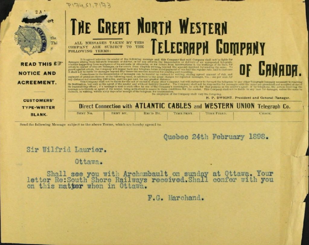 Télégramme de Félix-Gabriel Marchand à Wilfrid Laurier, 24 février 1898, Archives nationales à Québec, Fonds Félix-Gabriel Marchand, (03Q,P174,S1,P173).