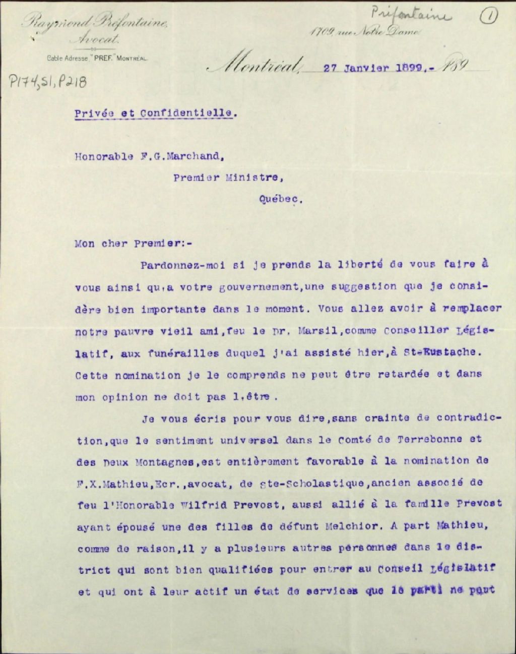 - Correspondance privée et confidentielle : Nomination d¿un successeur au Dr Marsil (Marcil), conseiller législatif décédé. Appuie la nomination de F.-X. Mathieu. Donne des détails à propos de divers candidats à ce poste