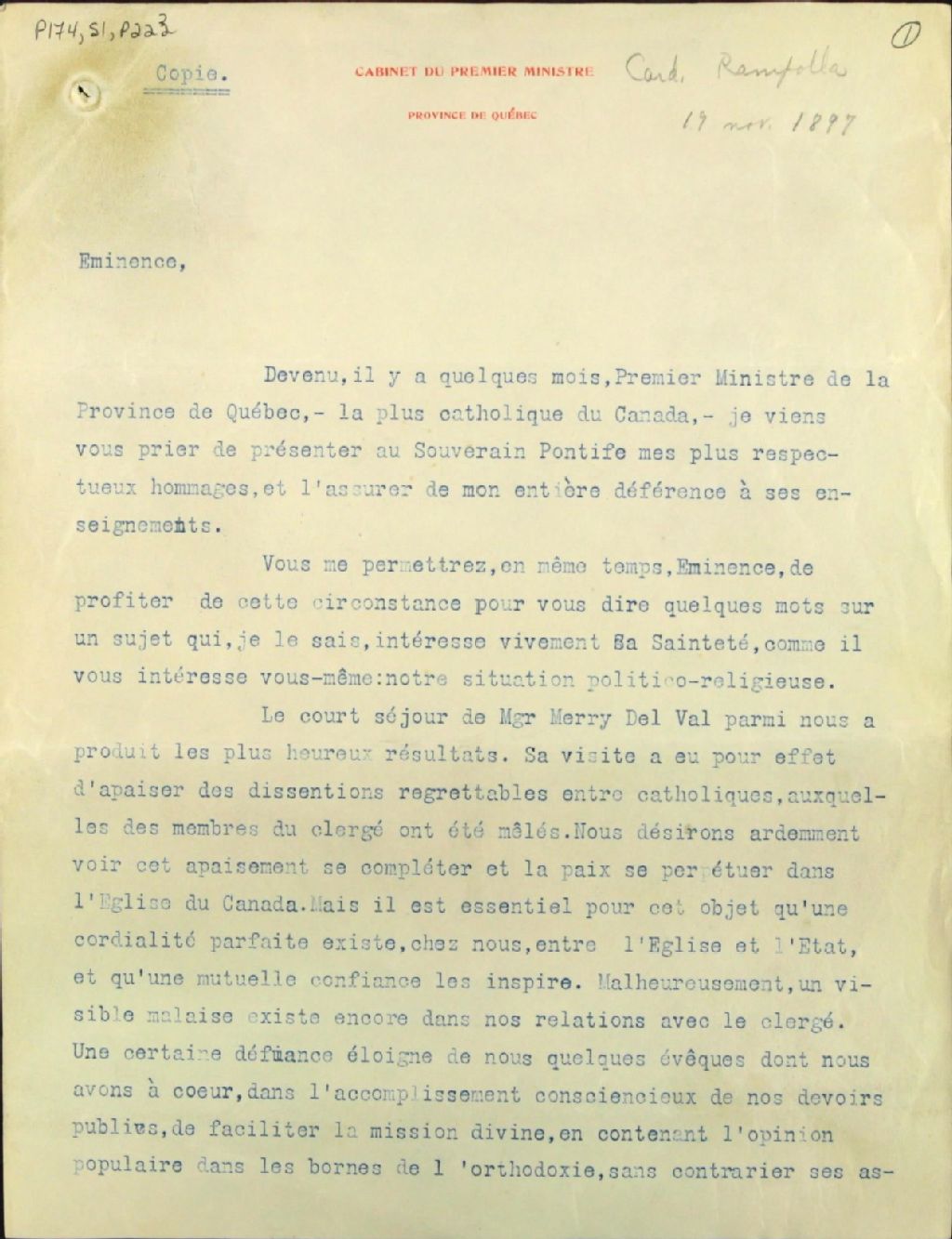 Lettre de Félix-Gabriel Marchand au Cardinal Rampolla