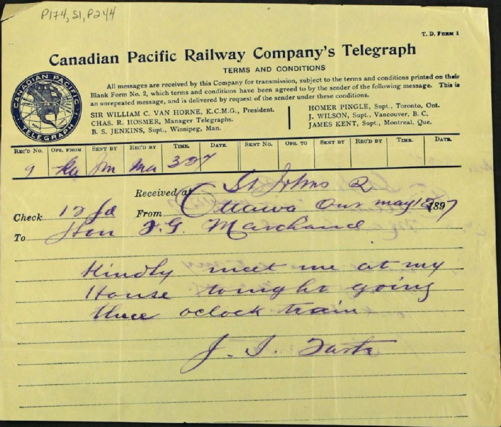 Télégramme de Monsieur Joseph-Israël Tarte à Félix-Gabriel Marchand, 12 mai 1897, Archives nationales à Québec, Fonds Félix-Gabriel Marchand, (03Q,P174,S1,P244).
