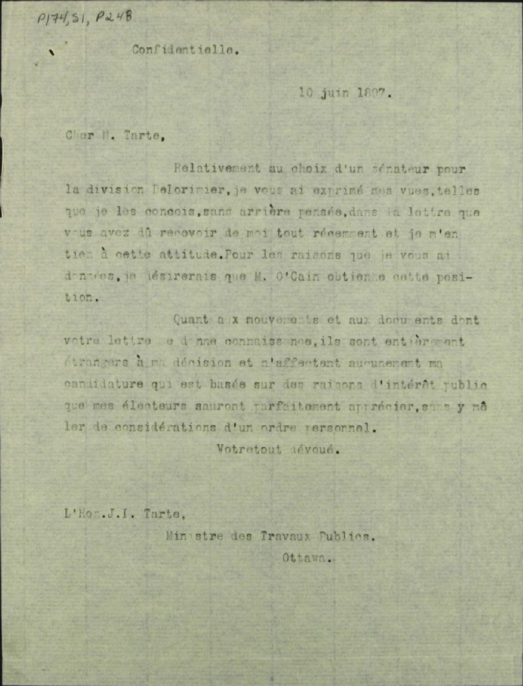 Correspondance confidentielle : En réponse à sa lettre du 8 juin, Marchand affirme que sa décision de recommander O¿Cain est étrangère à la cabale en faveur de ce dernier