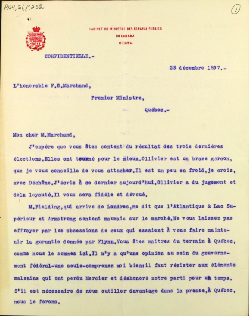 Correspondance confidentielle : Élections complémentaires et Chemin de fer de la Rive-Sud : Éloge d¿Ollivier élu lors d¿une élection complémentaire. Il faut résister à la Compagnie Atlantique et Lac Supérieur d¿Armstrong qui veut faire maintenir la garantie donnée par Flynn pour la construction du chemin de fer de la Rive-Sud. Selon Fielding, de retour de Londres, Armstrong et sa compagnie sentent mauvais sur le marché. « ¿il faut résister aux éléments malsains qui ont perdu Mercier et déshonoré notre parti pour un temps »