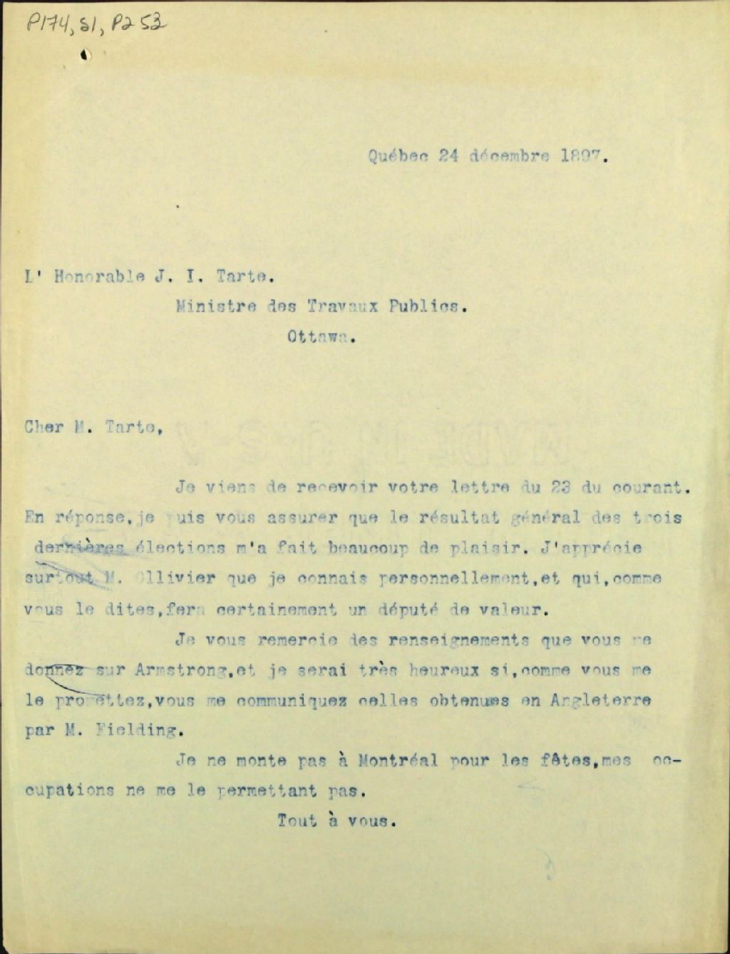 Lettre de Félix-Gabriel Marchand à Monsieur Joseph-Israël Tarte, 24 décembre 1897, Archives nationales à Québec, Fonds Félix-Gabriel Marchand, (03Q,P174,S1,P253).