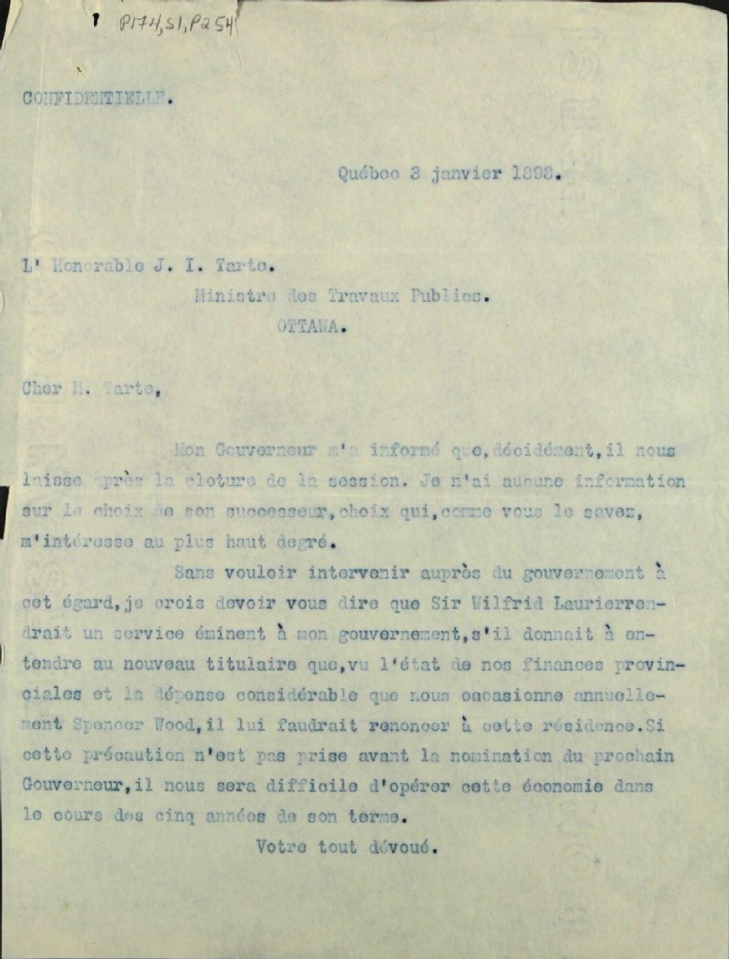 Correspondance confidentielle : Spencer Wood : Laurier devrait donner à entendre au futur lieutenant-gouverneur qu¿il lui faudra renoncer à Spencer Wood, vu l¿état des finances de la province