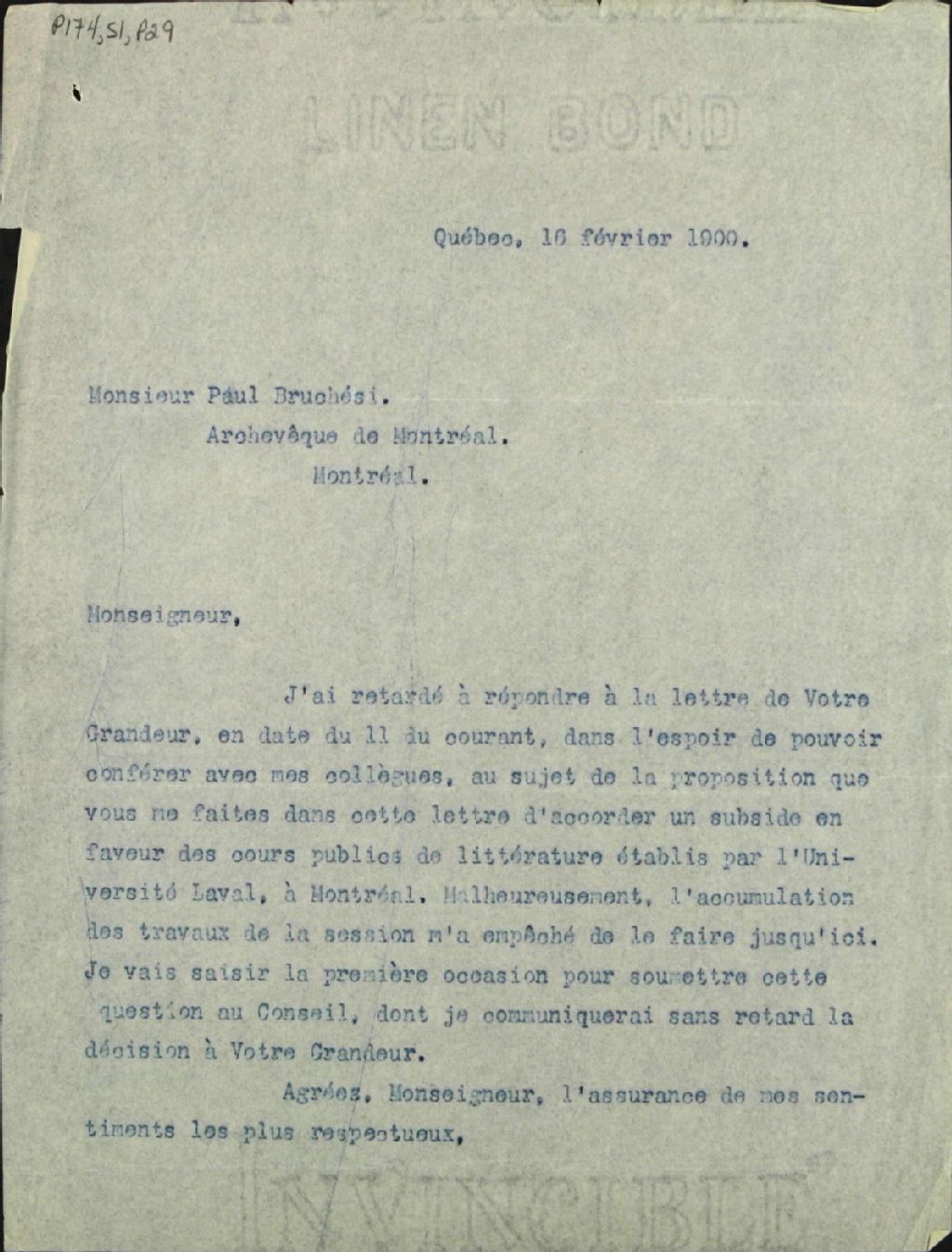 Lettre de Félix-Gabriel Marchand à Monseigneur Paul Bruchési, 16 février 1900, Archives nationales à Québec, Fonds Félix-Gabriel Marchand, (03Q,P174,S1,P29).