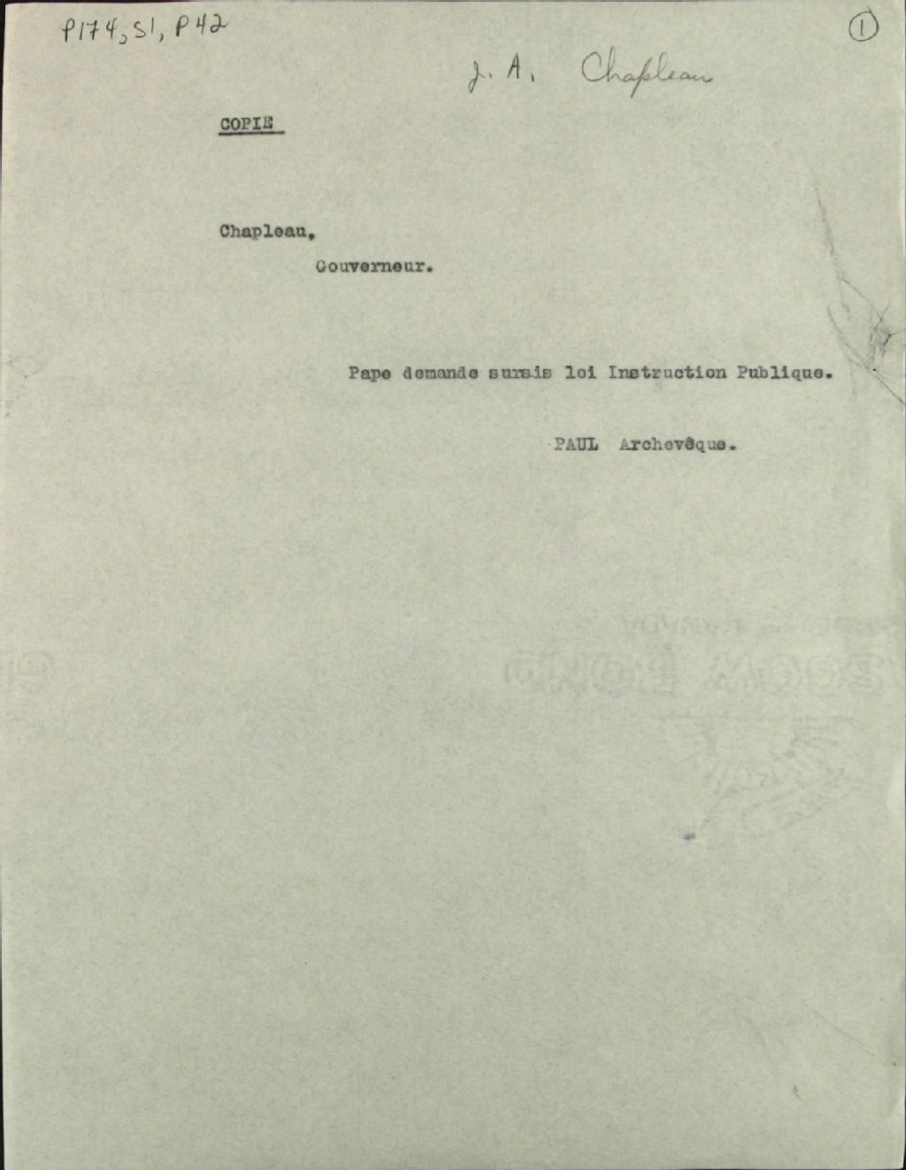 - Petit dossier de la correspondance reçue et envoyée par Chapleau à propos du projet de loi de l¿Instruction publique (copie) :1- Télégramme de Mgr Bruchési à J.-A. Chapleau (22 novembre 1897) disant que le Pape demande se surseoir à la présentation du projet de loi. 1 page.2- Télégramme de J.-A. Chapleau au Cardinal Rampolla, secrétaire d¿État, (7 décembre 1897) disant que le retrait du projet de loi serait désastreux pour la paix et la bonne entente dans la province et que Marchand serait forcé de donner sa démission. 1 page.3- Télégramme de M. Cardinal Rampolla à Sir Adolphe Chapleau (11 décembre 1897) disant que le Pape a voulu éviter toute innovation qui pût troubler la paix et non exercer des pressions indues. 1 page.4- Lettre de J.-A. Chapleau au Cardinal Rampolla (13 décembre 1897) expliquant pourquoi, à son avis, le projet de loi devrait être déposé en Chambre. (Privée). 5 pages5- Lettre de R. Cardinal Merry del Val à J.-A. Chapleau (17 décembre 1897) exprimant son accord avec le jugement que Chapleau porte sur la situation générale et les besoins du Québec et du Canada et trouvant « bien étrange » la manière d¿agir de Mgr Bruchési.Correspondance confidentielle. 1 page