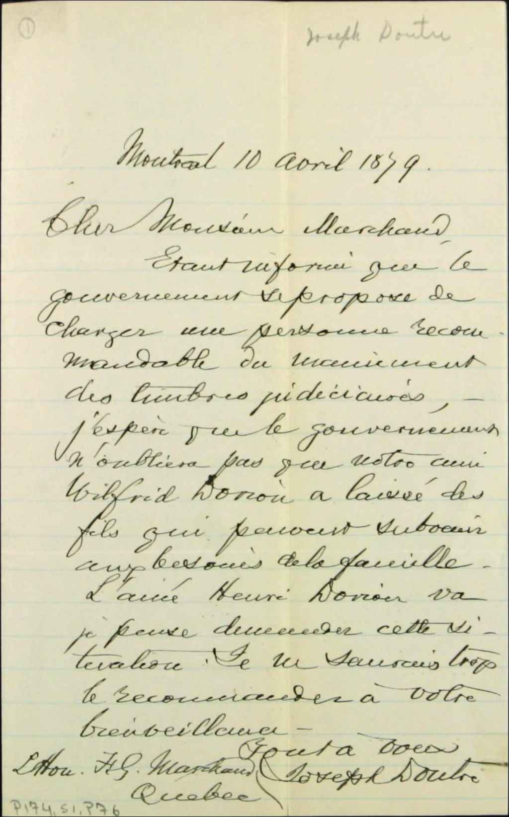 Lettre de Monsieur Joseph Doutre à Félix-Gabriel Marchand, 10 avril 1879, Archives nationales à Québec, Fonds Félix-Gabriel Marchand, (03Q,P174,S1,P76).