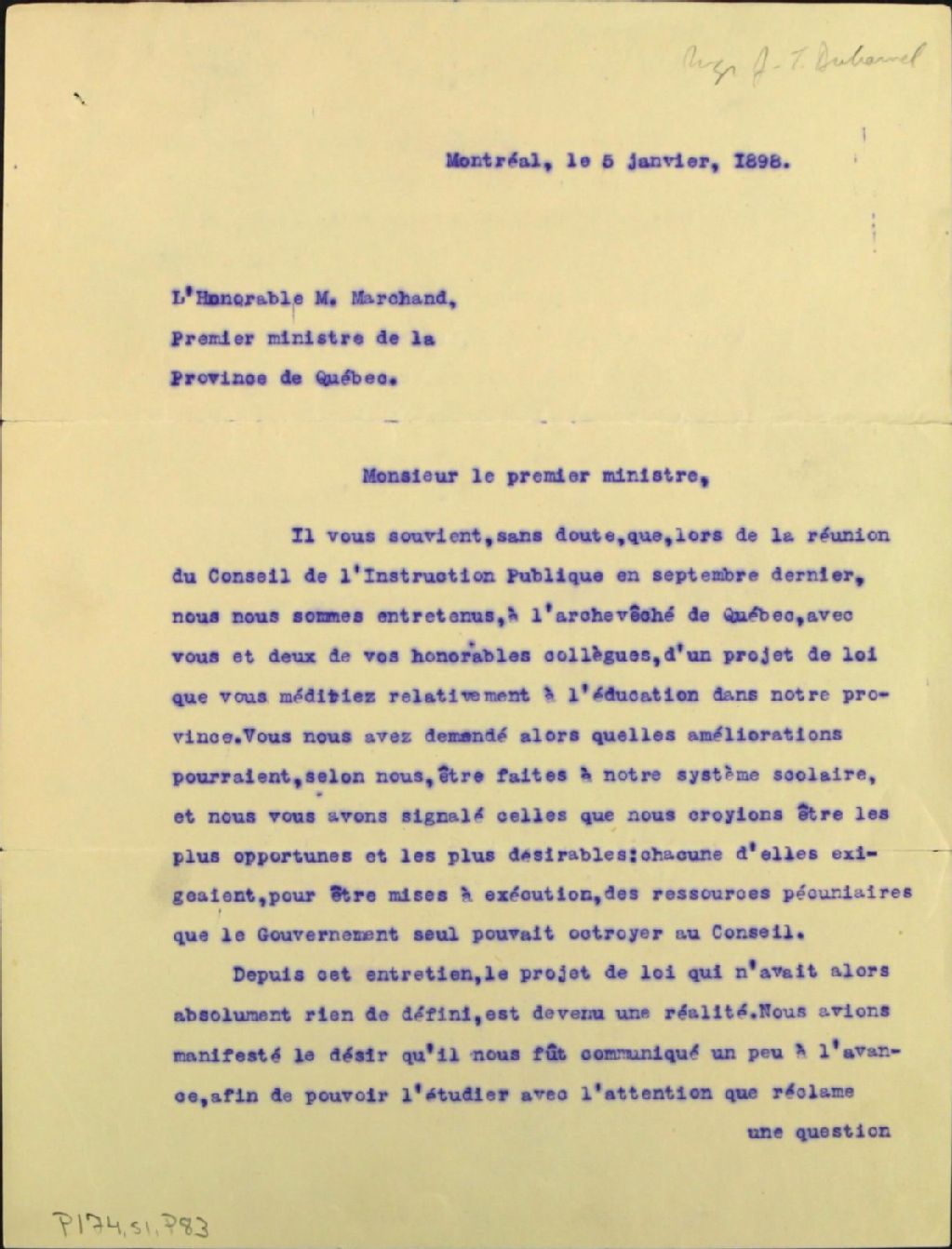 Lettre de Monseigneur Joseph-Thomas Duhamel à Félix-Gabriel Marchand, 5 juin 1898, Archives nationales à Québec, Fonds Félix-Gabriel Marchand, (03Q,P174,S1,P83).
