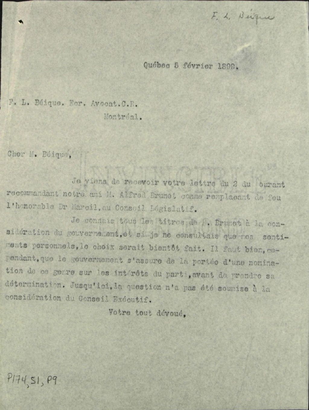 Lettre de Monsieur F.-L. Béïque à Félix-Gabriel Marchand, 5 février 1899, Archives nationales à Québec, Fonds Félix-Gabriel Marchand, (03Q,P174,S1,P9).
