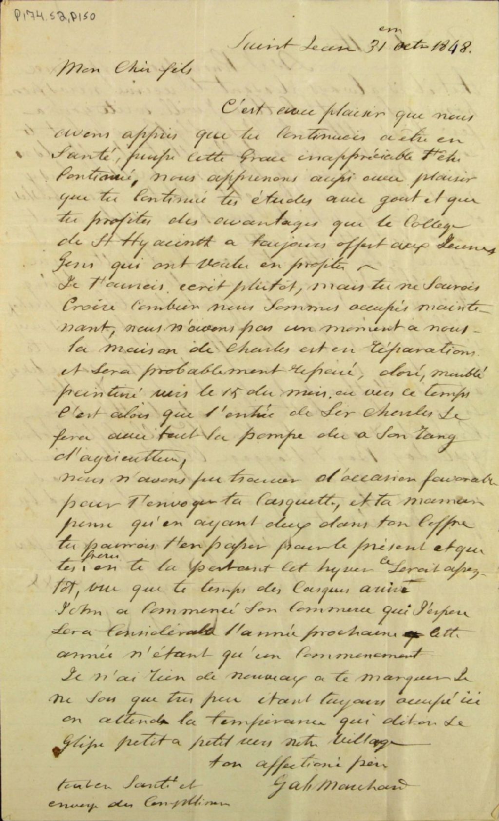 Lettre de Gabriel Marchand à son fils Félix-Gabriel Marchand, 31 octobre 1848, Archives nationales à Québec, Fonds Félix-Gabriel Marchand, (03Q,P174,S2,P150).