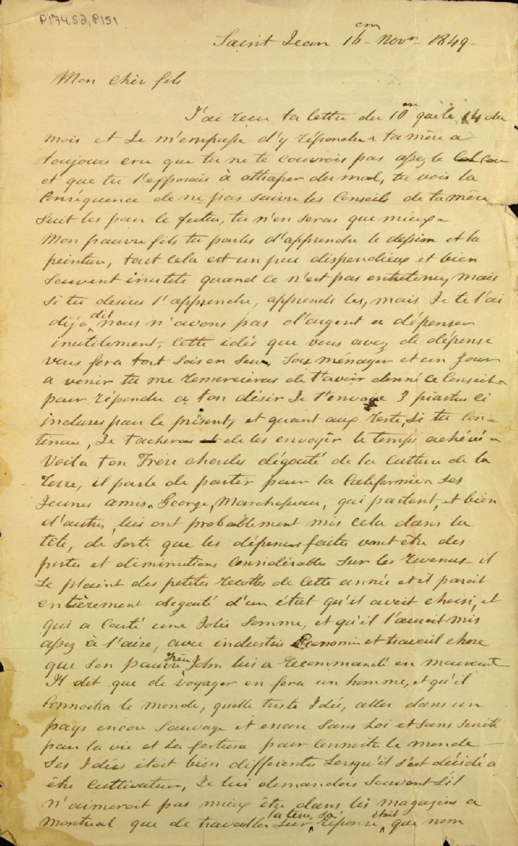 Gabriel Marchand écrit, entre autres, que Charles Marchand se plaint des petites récoltes de l¿année, qu¿il est dégoûté de l¿agriculture, état qu¿il avait choisi, et qu¿il veut s¿en aller en Californie avec des amis Georges et Marchesseau. Gabriel Marchand juge qu¿il devrait travailler à rendre sa terre fertile pour en retirer de l¿argent et une agréable aisance. Gabriel Marchand après avoir parlé du dégoût de son fils Charles pour l¿agriculture déclare : « C¿est une rage pour la Californie maintenant qui ne se calmera que lorsque les malheurs qui ordinairement accompagnent les richesses se feront sentir et alors revenu de ce désir ardent pour les richesse (sic) on se contentera du nécessaire ».Gabriel Marchand affirme aussi l¿inutilité des cours de dessin N.B. Les sept lettres de son père Gabriel Marchand (P174, S2, P149 à P155) ont toutes été envoyées de Saint-Jean durant les études de Marchand à Saint-Hyacinthe et à l¿occasion de son séjour en France au cours de l¿été 1850. On trouve dans cette correspondance des remarques très intéressantes sur l¿agriculture dans la région de Saint-Jean et autres sujets