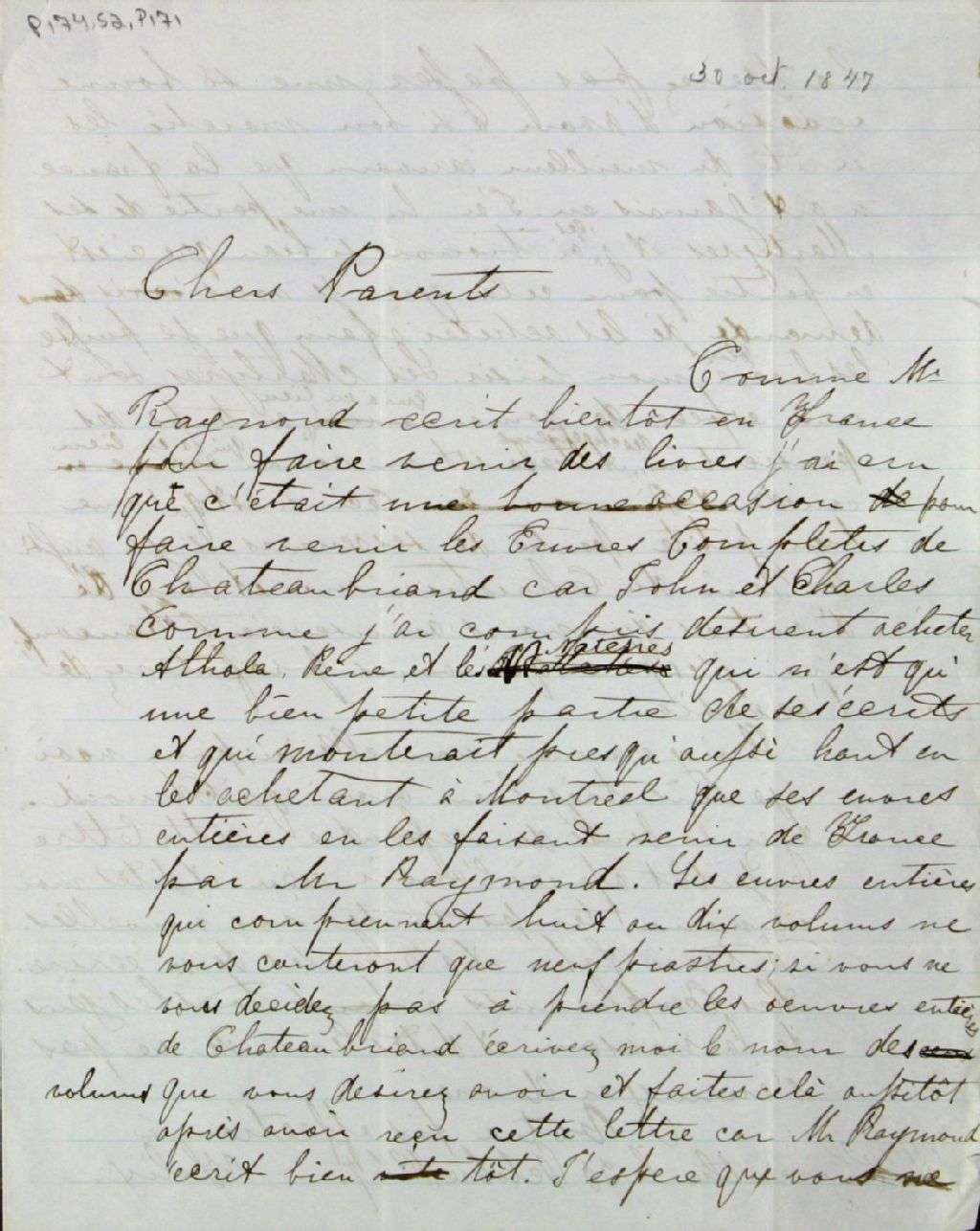 Marchand, au Collège de Saint-Hyacinthe, demande en particulier que ses parents lui fassent parvenir la somme de neuf dollars (9 $), prix d¿une commande en France des ¿uvres complètes de Châteaubriand, « le meilleur écrivain que la France n¿ait jamais eu ». Il appuie sa demande sur le fait qu¿à Montréal, il en coûterait le même prix pour se procurer seulement trois des ¿uvres de l¿écrivain, soit Atala, René et les Natchez. C¿est en partie parce qu¿il a trouvé les Martyrs « si beau » qu¿il désirerait obtenir les Oeuvres complètes de Châteaubriand. N.B. Les 34 lettres (P174,S2,P156 à P190) écrites par Marchand alors qu¿il était successivement étudiant au Collège de Chambly (1843) et au Collège de Saint-Hyacinthe (1845-1849), enfin durant son séjour en France au cours de l¿été 1850. Marchand écrit tantôt en français, tantôt en anglais. Ses lettres de Chambly et de Saint-Hyacinthe traitent généralement de ses études et de ses résultats en classe, de ses distractions. Les demandes de visites reviennent fréquemment, de même que les demandes d¿argent pour payer papier, leçons de musique, nécessaire à dessin, les demandes de linge, etc