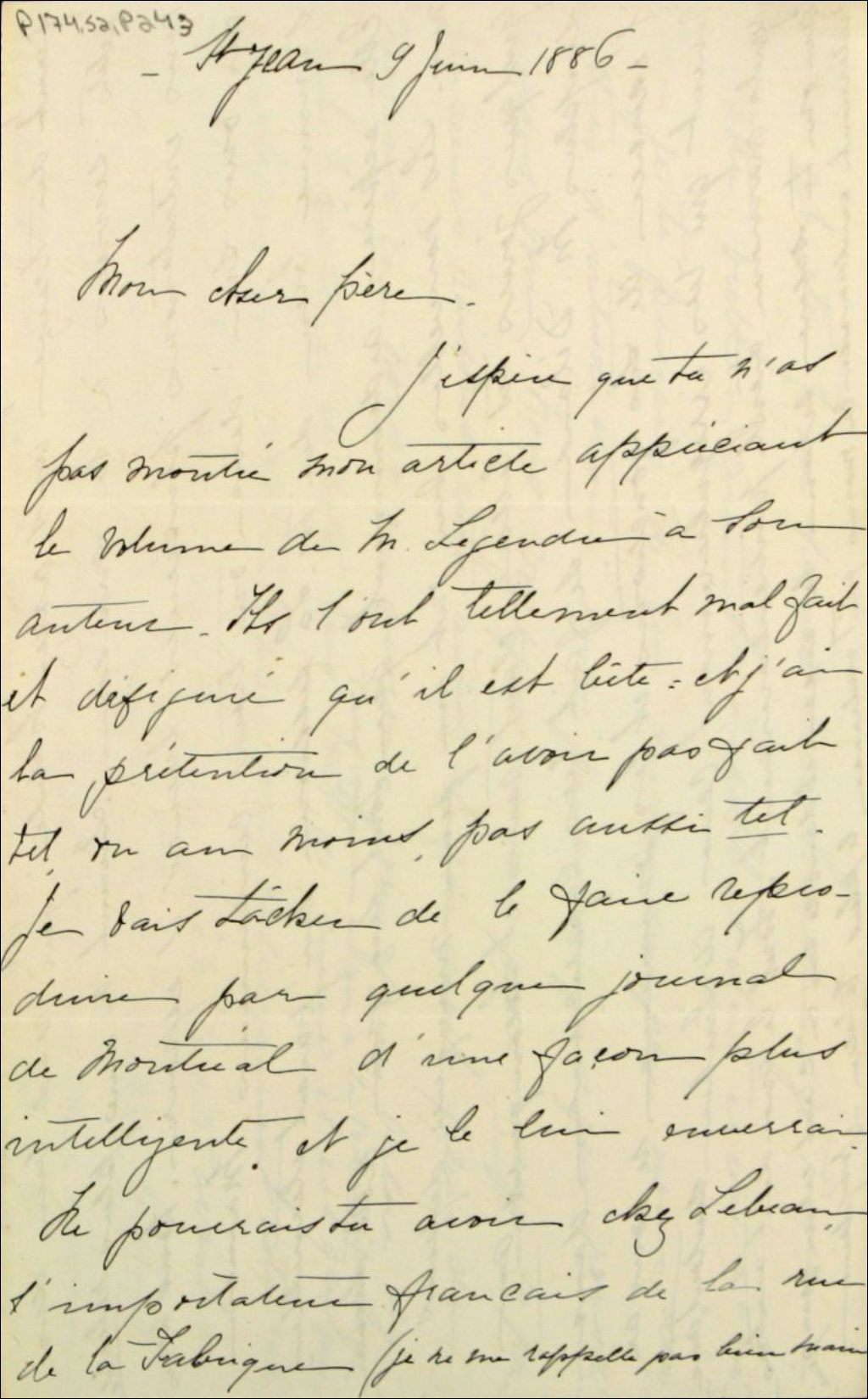 Lettre de Joséphine Marchand à son père Félix-Gabriel Marchand, 9 juin 1886, Archives nationales à Québec, Fonds Félix-Gabriel Marchand, (03Q,P174,S2,P243).