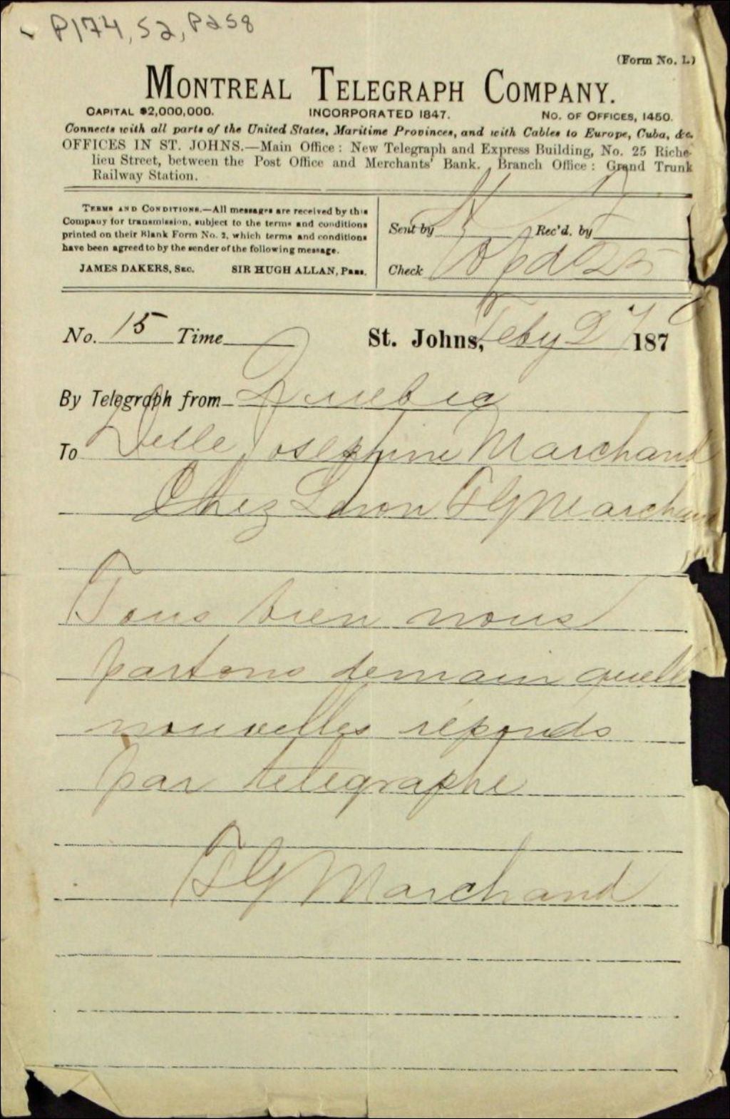 Lettre de Félix-Gabriel Marchand à sa fille Joséphine Marchand, 27 février 1879, Archives nationales à Québec, Fonds Félix-Gabriel Marchand, (03Q,P174,S2,P258).