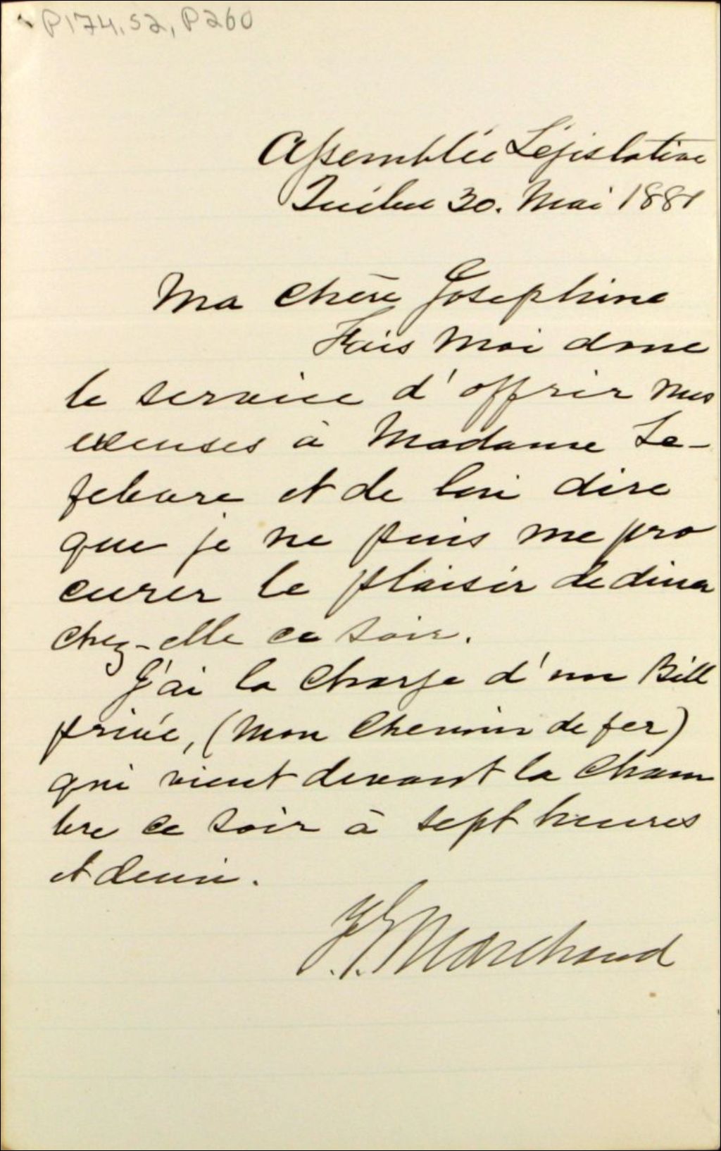 Lettre de Félix-Gabriel Marchand à sa fille Joséphine Marchand, 30 mai 1881, Archives nationales à Québec, Fonds Félix-Gabriel Marchand, (03Q,P174,S2,P260).