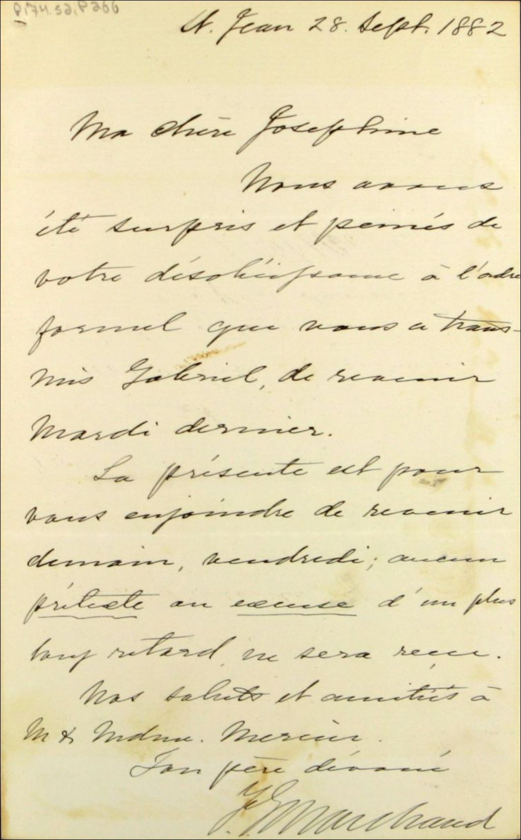 Lettre de Félix-Gabriel Marchand à sa fille Joséphine Marchand, 28 septembre 1882, Archives nationales à Québec, Fonds Félix-Gabriel Marchand, (03Q,P174,S2,P266).