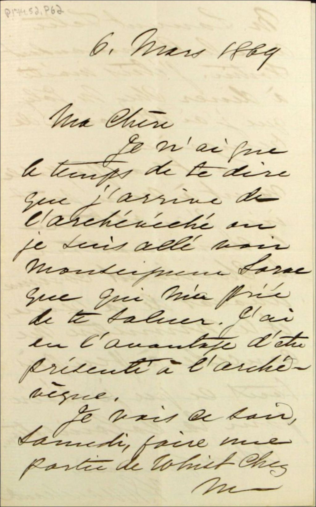 Lettre de Félix-Gabriel Marchand à sa femme Hersélie Turgeon, 6 mars 1869, Archives nationales à Québec, Fonds Félix-Gabriel Marchand, (03Q,P174,S2,P62).