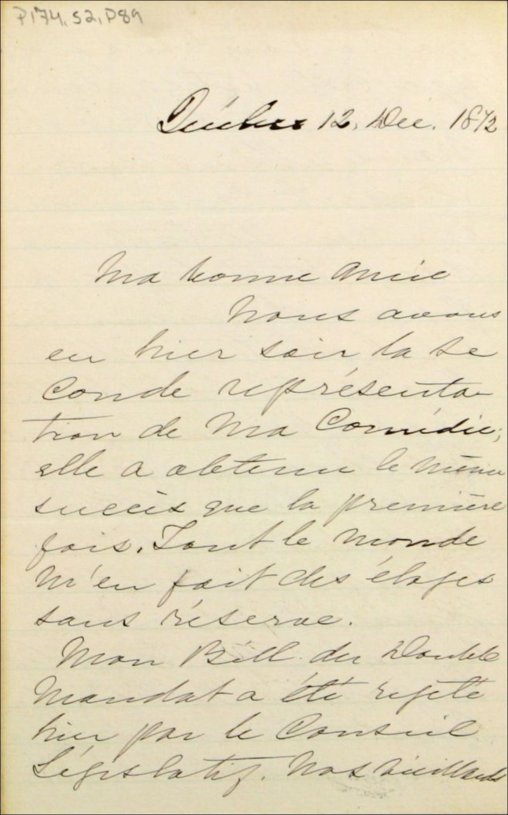 - La seconde représentation de sa pièce a eu autant de succès que la première. Son projet de loi à propos du double mandat a été battu la veille au Conseil Législatif. En conséquence les libéraux vont commencer une campagne en faveur de l¿abolition du conseil. Le gouvernement est impliqué dans l¿affaire de l¿asile de Beauport. « Si les moutons ne sont pas trop effarouchés, ils nous aideront à former une majorité contre leurs maîtres ». Chauveau, effrayé, les a presque implorés privément de ne pas le pousser au pied du mur. Quelques petites affaires familiales