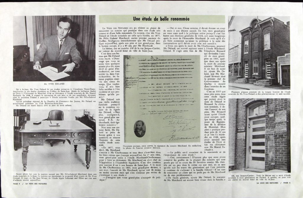 - Extrait de la Voix des Notaires, avril 1964, au sujet de l¿étude notariale fondée par Marchand en 1877 et continué en 1964 par un descendant de l¿associé de ce dernier