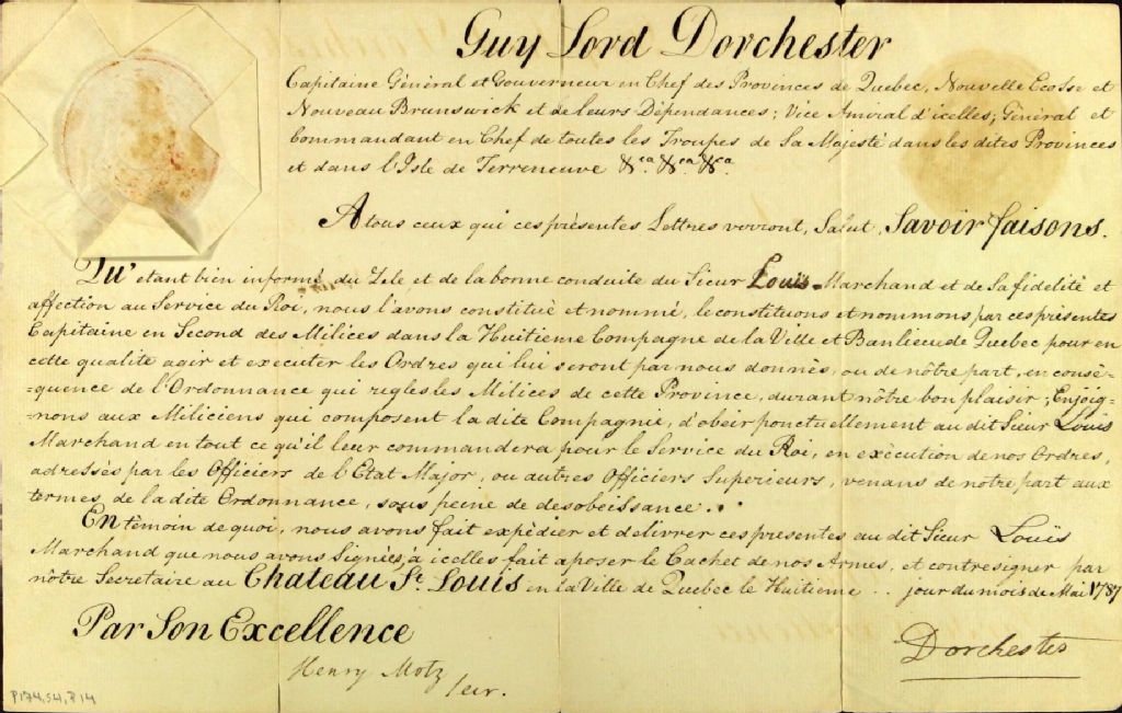 Commission de capitaine de milice en second, 8e Compagnie, ville et banlieue de Québec, accordée en 1787 par Dorchester à Louis Marchand, père de Gabriel Marchand