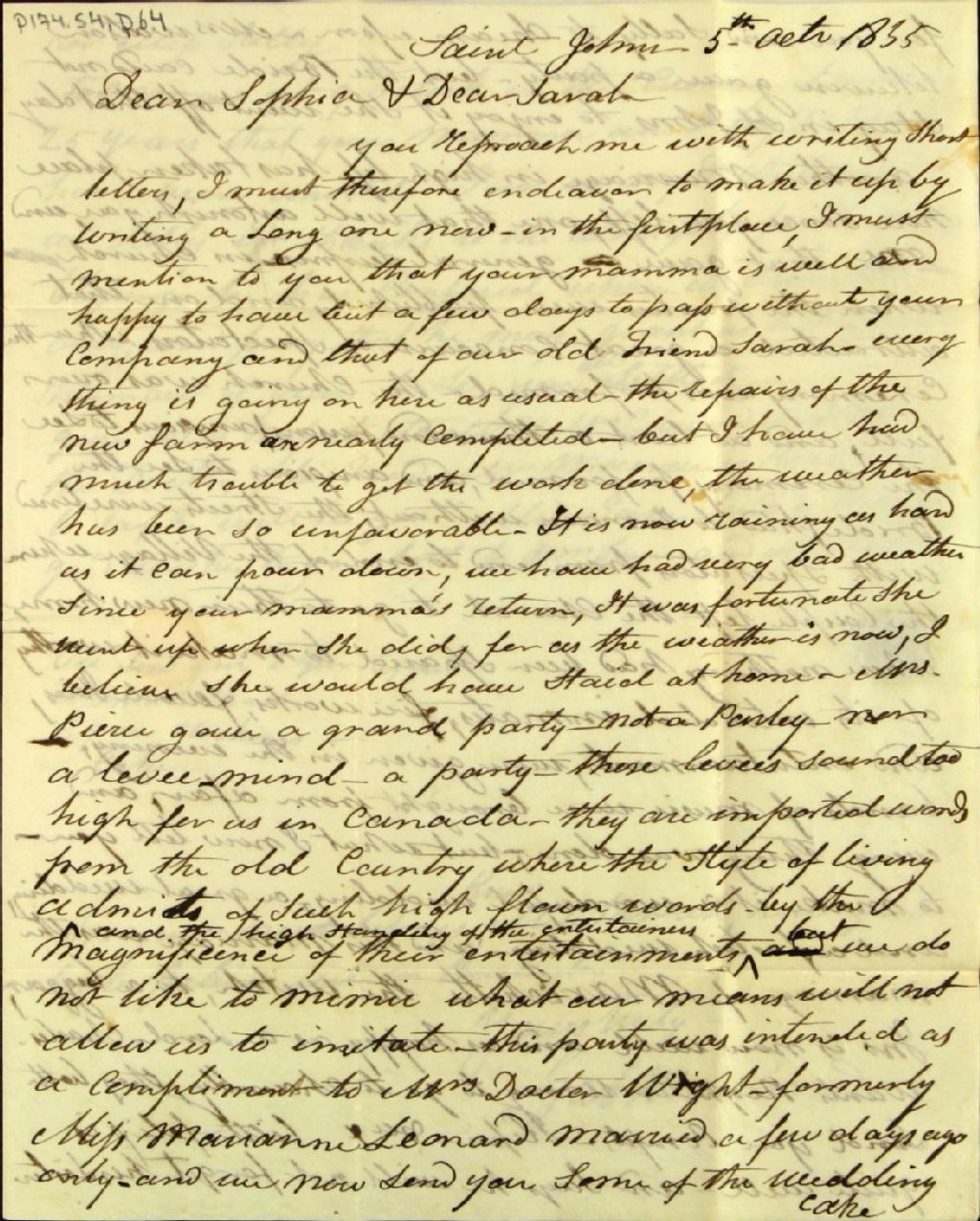 - Gabriel Marchand raconte le mariage de « Marichette, the witch, to a beggar » insistant sur l¿émoi et l¿attroupement que ce mariage a causés. N.B. Cinq lettres (P174,S4,P62 à P66) sont adressées à Sophia Marchand alors qu¿elle étudiait à Burlington