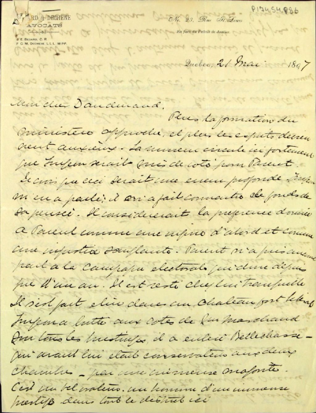 - Lettre de F.-G. Miville Dechêne à Raoul Dandurand. Québec