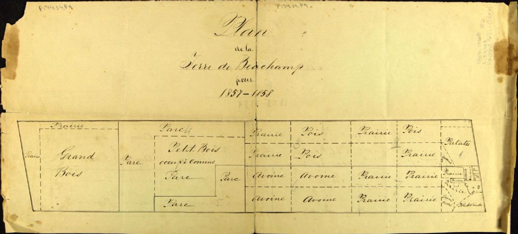 - Sur ce plan recto verso de la terre de Beauchamp pour les années 1857-1858 et 1858-1859 située dans la ville de Saint-Jean-sur-Richelieu figurent les bâtiments, les terres cultivées et non cultivées identifiées par parc, prairies et bois et les types de cultures. Mentions sur le plan : Grand bois, Parc, Petit bois accupé comme parc, Prairies nouvelles, Vieilles prairies, orge, graine de foin, blé d'Inde, avoine, pos, patate, carottes, betteraves, légumes divers, jardin, verger, basse-cour