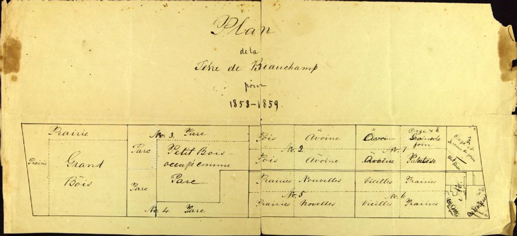 Sur ce plan recto verso de la terre de Beauchamp pour les années 1857-1858 et 1858-1859 située dans la ville de Saint-Jean-sur-Richelieu figurent les bâtiments, les terres cultivées et non cultivées identifiées par parc, prairies et bois et les types de cultures. Mentions sur le plan : Grand bois, Parc, Petit bois accupé comme parc, Prairies nouvelles, Vieilles prairies, orge, graine de foin, blé d'Inde, avoine, pos, patate, carottes, betteraves, légumes divers, jardin, verger, basse-cour