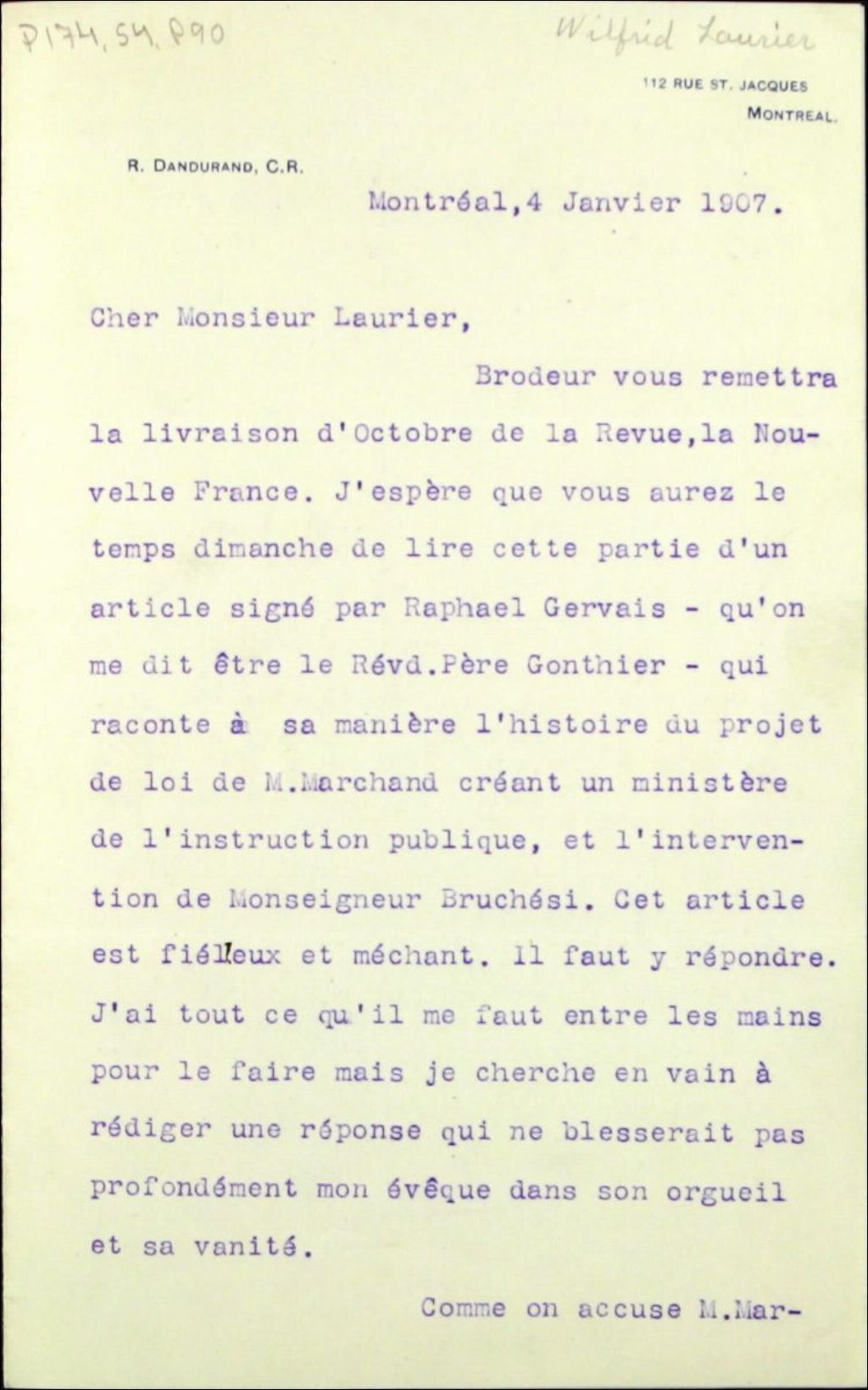 - Un article publié dans le numéro d¿octobre de la revue Nouvelle-France accuse Marchand de s¿être conduit d¿une manière déloyale envers le Saint-Siège dans l¿affaire du projet de loi de l¿Instruction publique. Dandurand demande à Laurier si, plutôt que de publier la correspondance de Marchand à ce sujet, il ne serait pas préférable de s¿adresser directement au Cardinal Merry del Val, secrétaire d¿État