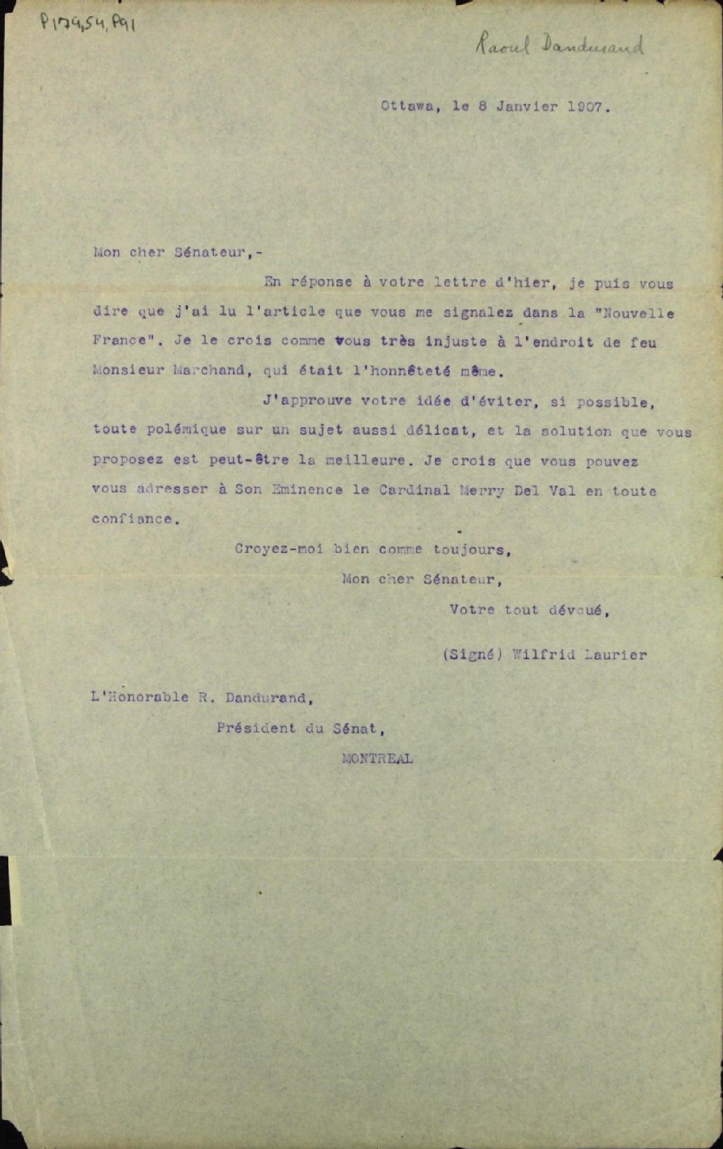 Lettre de Wilfrid Laurier à Raoul Dandurand. Ottawa, 8 janvier 1907, Archives nationales à Québec, Fonds Félix-Gabriel Marchand, (03Q,P174,S4,P91).