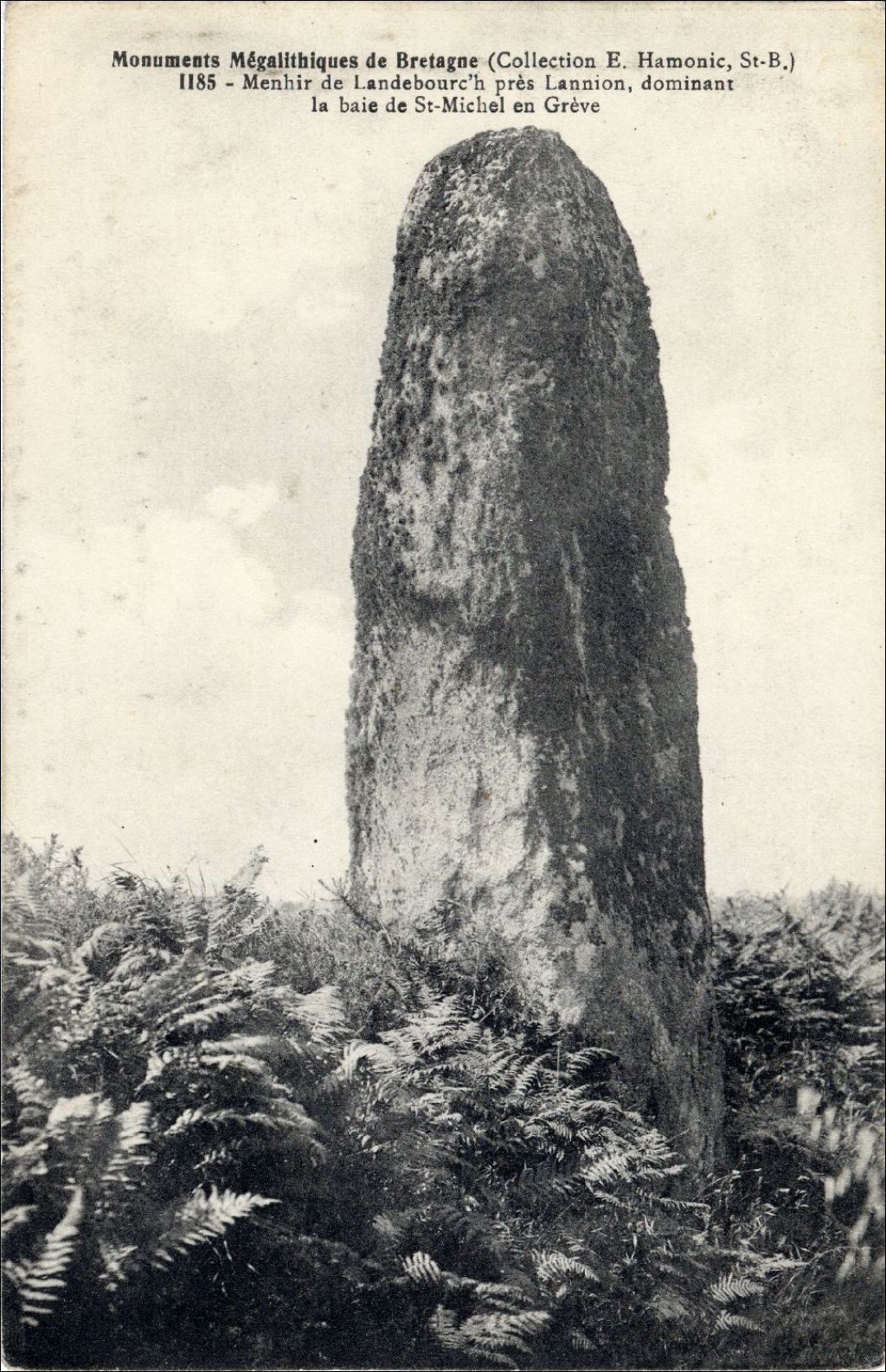 Landerbourc'h, menhir, département Côtes-d'Armor, région Bretagne, [Vers 1890-vers 1965], Archives nationales à Québec, Collection Magella Bureau, (03Q,P547,S1,SS3,D1122), Photographe non identifié.