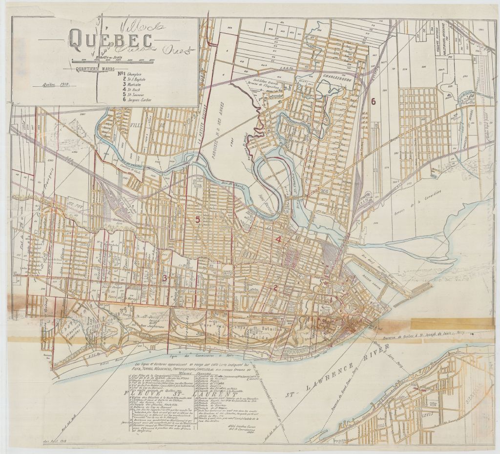 Plan index des chemins de fer de la ville de Québec. Y figurent une partie de la rivière Saint-Charles, les quartiers, les rues ainsi que les noms Canadian Pacific Railway, Quebec Gosfod Railway, Northern Trans-Continental Railway, CNQ Railway, Q & L Saint John Railway et Q.R.L. & P. Railway. Ce plan comporte des lignes et des écritures en rouge indiquant les fiefs, les terres, les résidences, les fortifications et les chapelles aux diverses époques du régime français