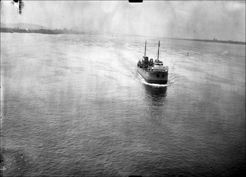 Montréal, un bateau sur le fleuve, et le pont Jacques-Cartier en construction à l'arrière-plan, [Vers 1927], Archives nationales à Québec, Fonds Ministère des Terres et Forêts, (03Q,E21,S110,SS1,SSS1,PK100-1), Cie aérienne franco-canadienne.