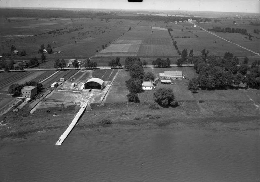 Hydrobase de la Compagnie aérienne franco-canadienne à Pointe-aux-Trembles (Montréal), rue Notre-Dame et terres en culture