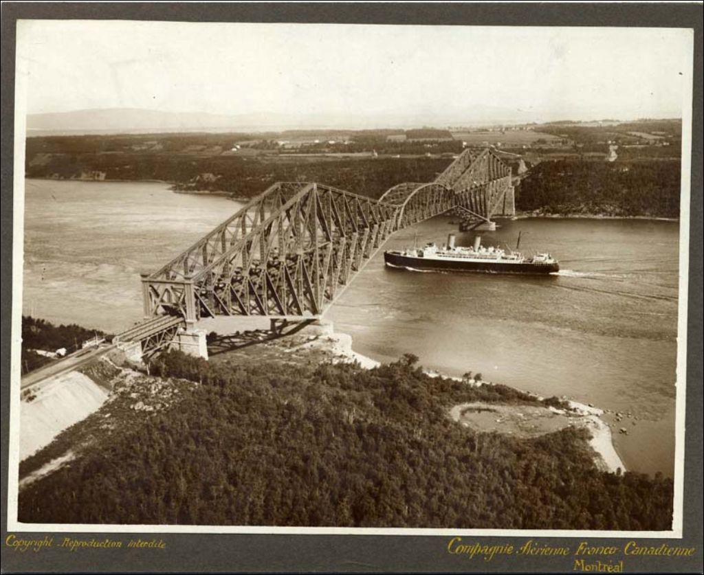 Ville de Québec: bateau passant sous le pont de Québec, [Vers 1927], Archives nationales à Québec, Fonds Ministère des Terres et Forêts, (03Q,E21,S110,SS1,SSS1,PP75-B17), Cie aérienne franco-canadienne.
