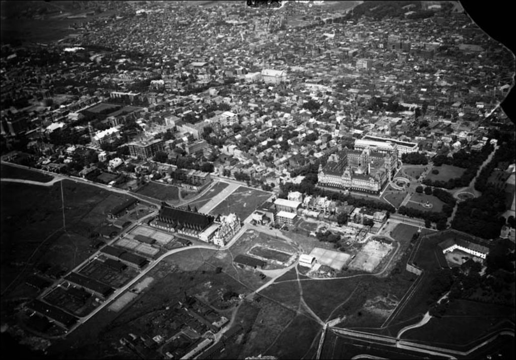 Ville de Québec, quartiers Saint-Jean-Baptiste et Saint-Roch. On y voit le Parlement, le manège militaire, l'église Saint-Jean-Baptiste ainsi que l'église Saint-Coeur-de-Marie, [Vers 1927], Archives nationales à Québec, Fonds Ministère des Terres et Forêts, (03Q,E21,S110,SS1,SSS1,PP75-B3), Cie aérienne franco-canadienne.