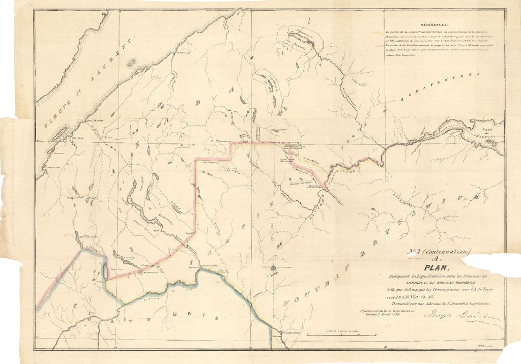 Plan indiquant la ligne frontière entre les provinces du Canada et du Nouveau-Brunswick telle que défini par les commissaires sous l'Acte Impérial 14 et 15, Vict. ch. 63.