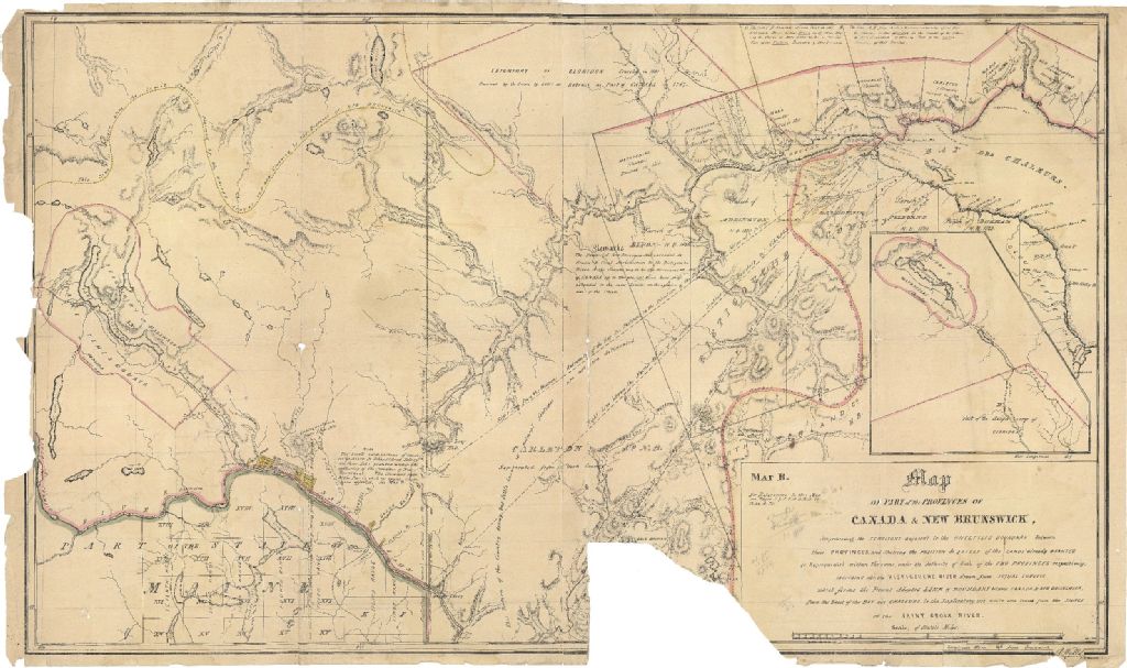 Map showing the Southern boundary of the Province of Canada according to the Royal Proclamation of 1763 and the Imperial Act of 1774 called the Quebec Act distinguishing that portion of the boundary settled conventionally with the United States by the Treaty of Washington in 1842 and exibiting the line of boundary claimed by the Province of New Brunswick. Map B.