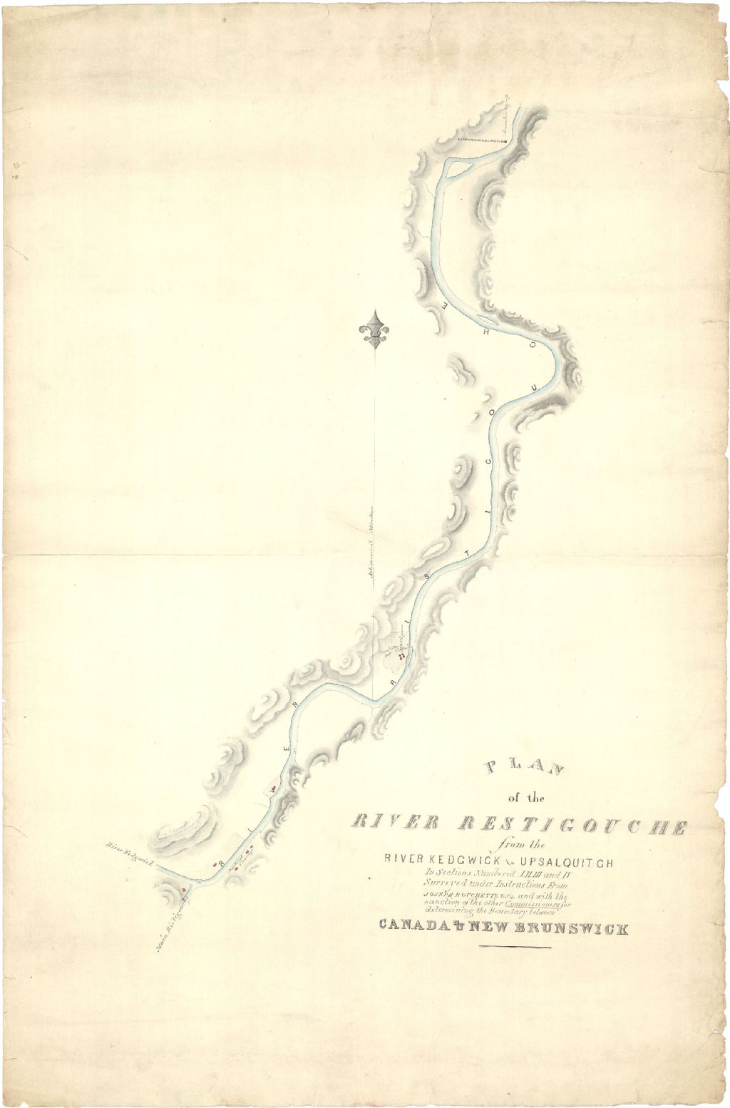 Plan of the River Restigouche from the River Kedewick to Upsalquitch [...] In sections numbered I, II, III, and IV surveyed under instructions from Joseph Bouchette esq. and with the sanction of the other Commissioners for determining the Boundary between Canada & New Brunswick