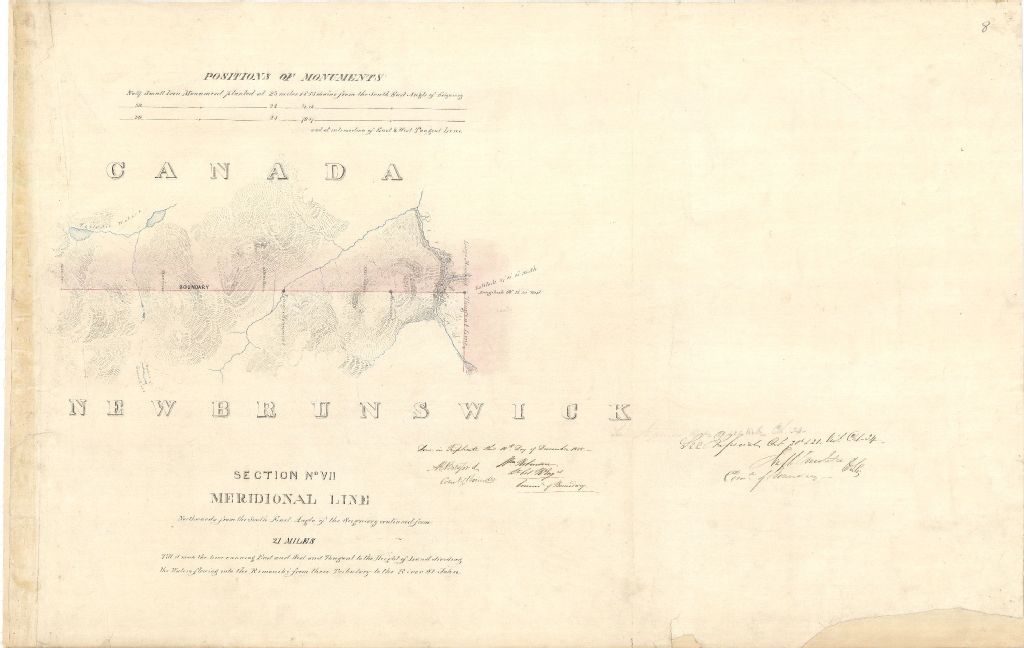 Frontières Canada / Nouveau-Brunswick. Section no. 7 Meridional Line, northwards from the south east angle of the seigniory from 21 miles till it meets the line running east and west and tangent to the height of land dividing the water flowing into the Rimouski from those Triburary to the River St. John.