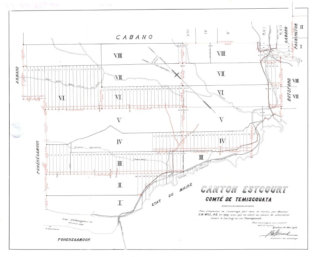 Estcourt, comté de Témiscouata; plan d'inspection de l'arpentage fait dans ce canton par M. D.W. Mill, a.g., en 1909 ainsi que le relevé du chemin de colonisation reliant le lac long au Lac Pohénégamook