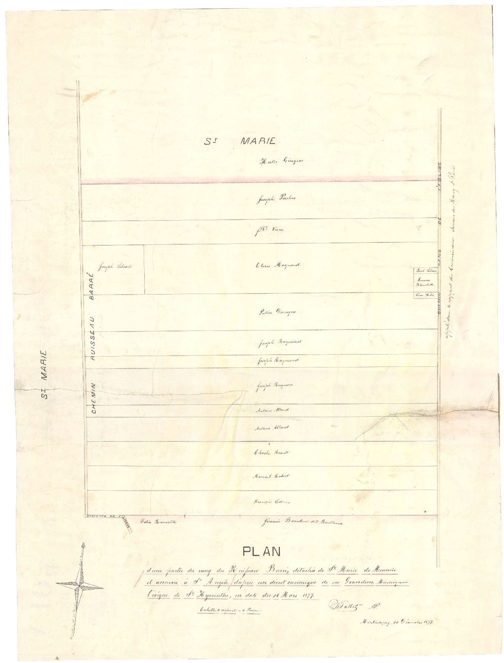 Plan d'une partie du rang du ruisseau Barré détachée de Sainte-Marie-de-Monnoir et annexée à Sainte-Angèle d'après un décret canonique de sa Grandeur Monseigneur [...] en date du 26 mars 1877.