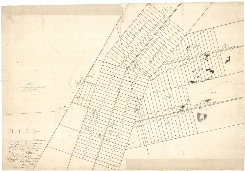 Sur ce plan des limites de la paroisse Saint-Alexandre figurent le numéro des lots, les chemins et le nom des concessions